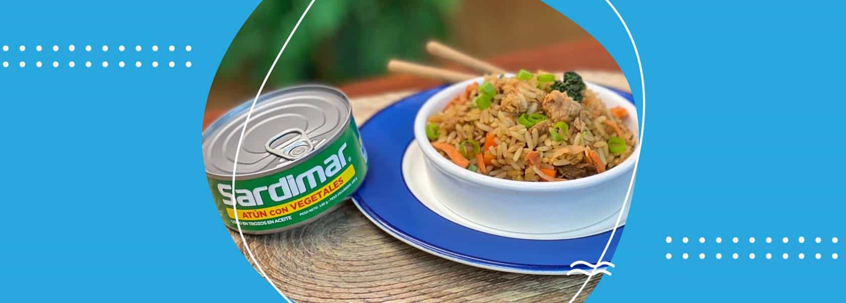 - Luego, incorporamos el arroz cocinado, revolvemos con dos tenedores, añadimos el cebollín, el aceite de ajonjolí y el atún SARDIMAR.