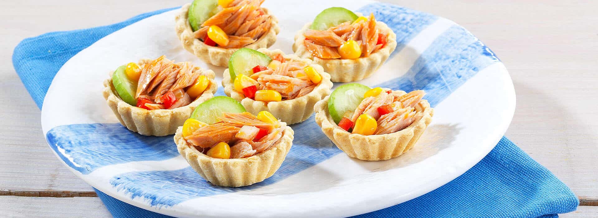 - ¡En la canastita ponemos la rodaja de pepino y una cucharada de atún con maíz dulce servimos y listo!