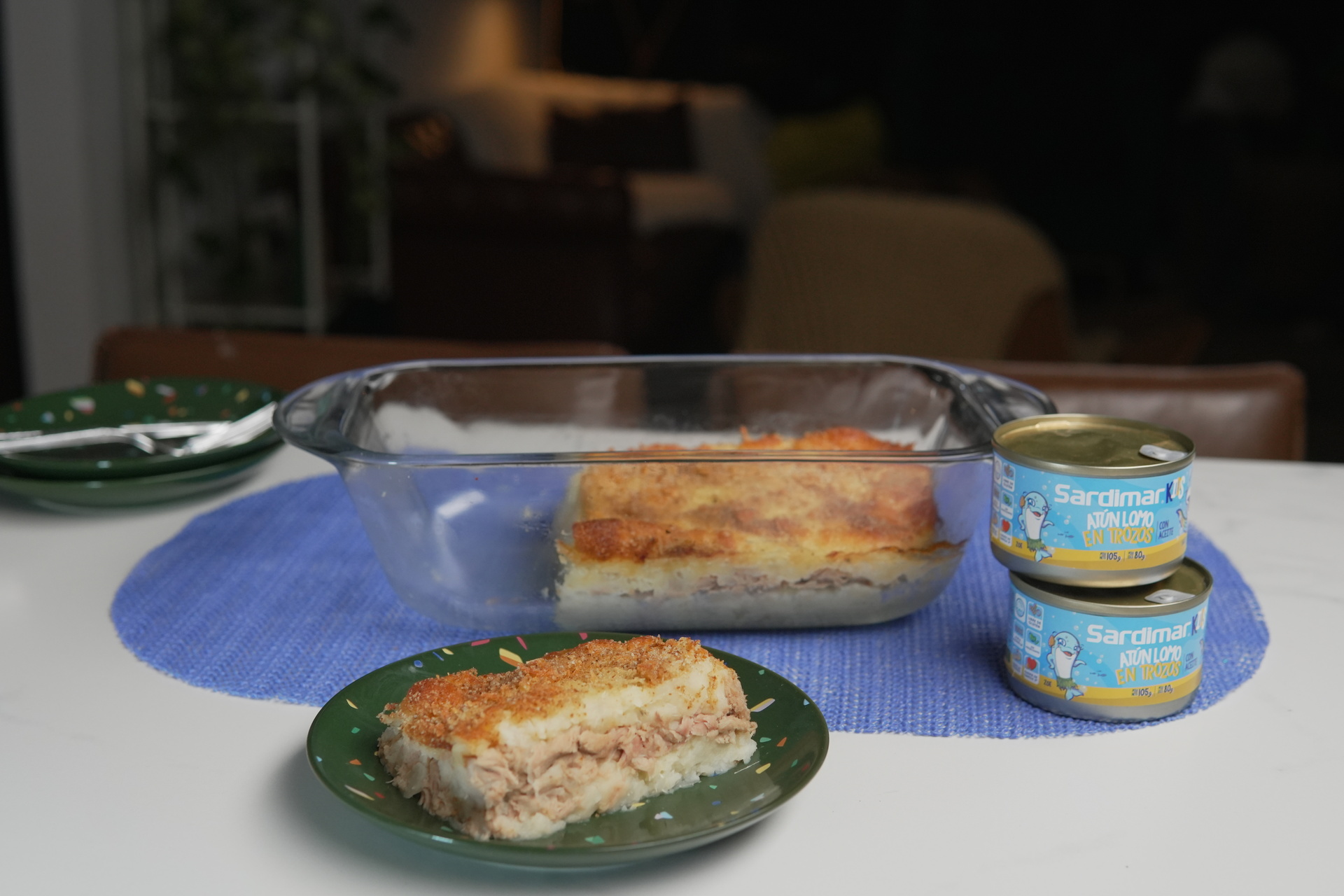 - Tapar el atún con la otra mitad de la mezcla, añadir el queso restante, el pan molido y el aceite de oliva.