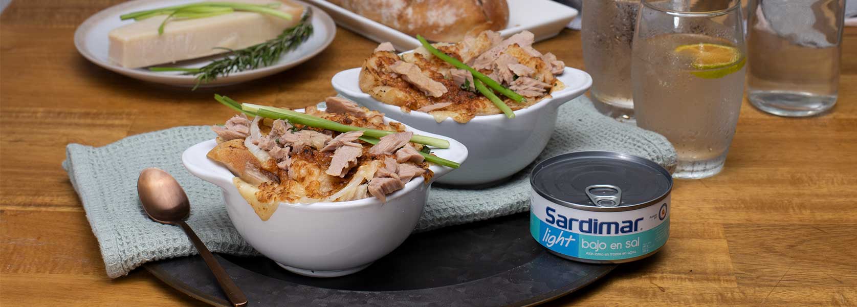 - Serví la sopa en pirex pequeños y gratinala en el horno colocando encima la rebajada de pan, el queso y un poco más de atún.